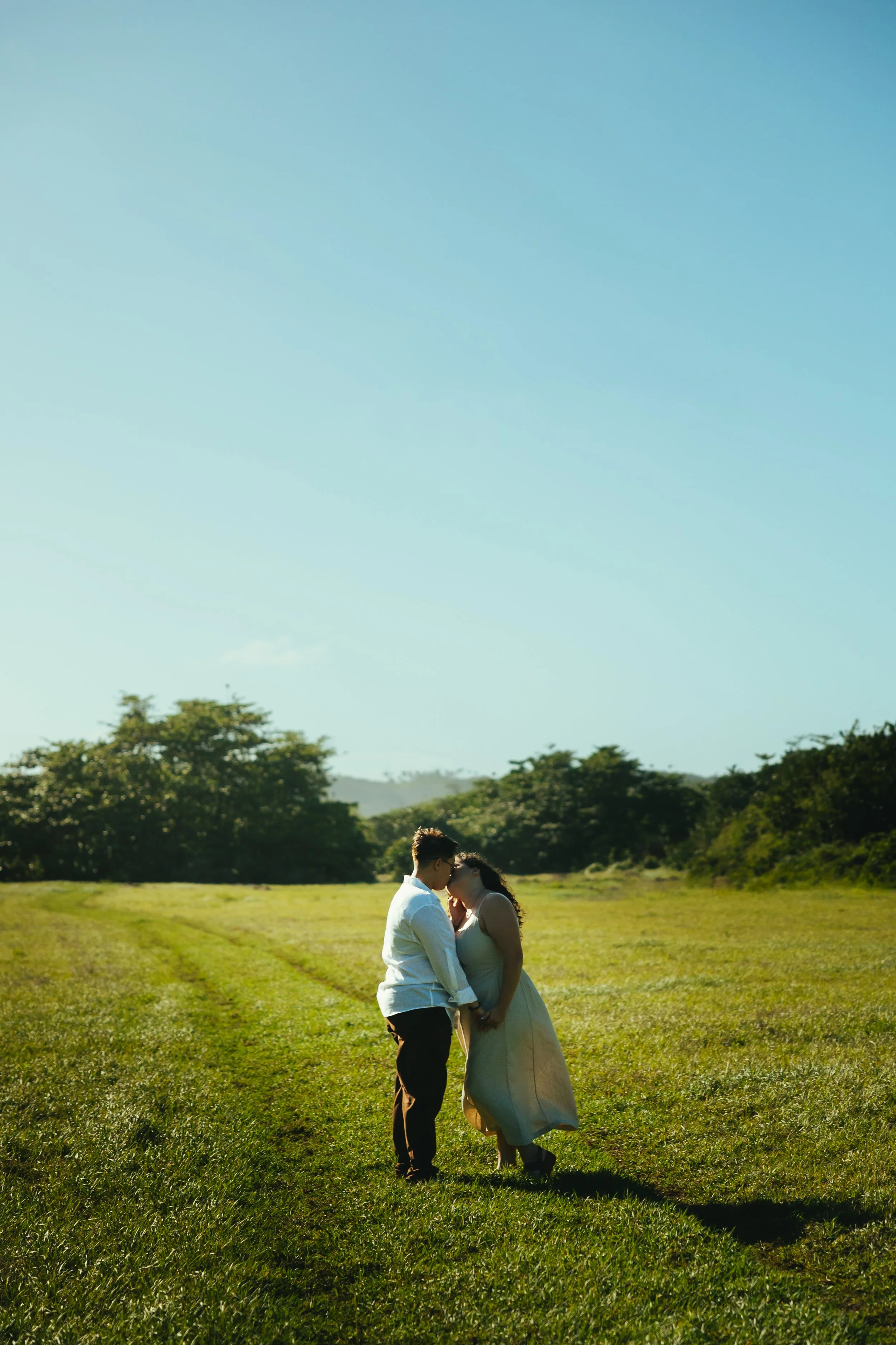 A couple standing on the beach, smiling at each other, with the ocean behind them. The woman is wearing a blue dress, and the man is wearing a tropical patterned shirt and shorts.